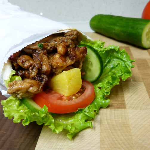 It's made with a warm and tender pita filled with juicy strips of our signature marinated chicken meat, pineapples, lettuce, cucumbers, tomatoes and sweetest of sweet sauces.